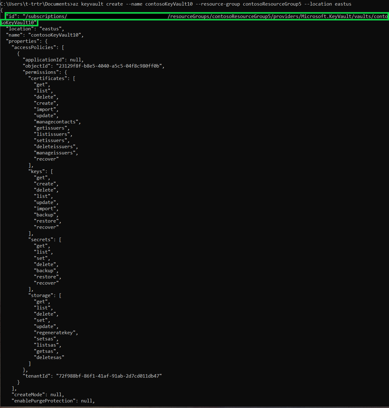 az keyvault create --name contosoKeyVault10 --resource-group contosoResourceGroup5 --location eastus