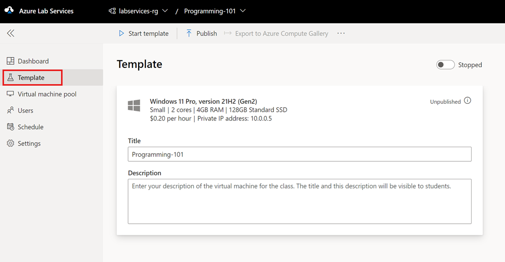 Você personalizou o modelo de laboratório para o curso. Depois de publicar, cada VM no laboratório tem a mesma configuração que a VM de modelo.