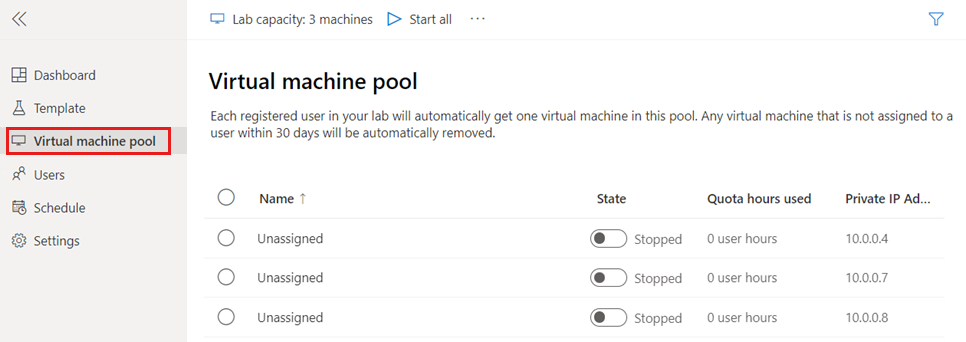 As VMs de laboratório estão atualmente paradas e não atribuídas, o que significa que elas não são atribuídas a usuários específicos do laboratório.