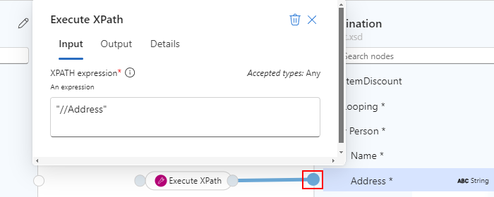 Este exemplo conecta a função ao nó Endereço no esquema de destino: