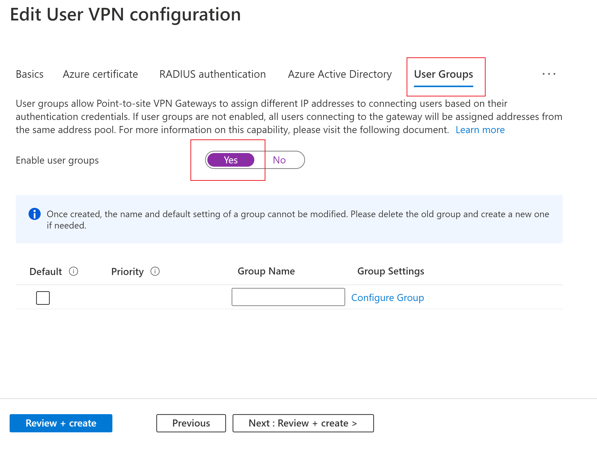 Selecione Sim para habilitar grupos de usuários. Quando essa configuração de servidor é atribuída a um gateway VPN P2S, os usuários que fazem parte dos mesmos grupos de usuários recebem endereços IP dos mesmos pools de endereços. Os usuários que fazem parte de grupos diferentes recebem endereços IP de grupos diferentes. Ao usar esse recurso, você deve selecionar Grupo padrão para um dos grupos criados.