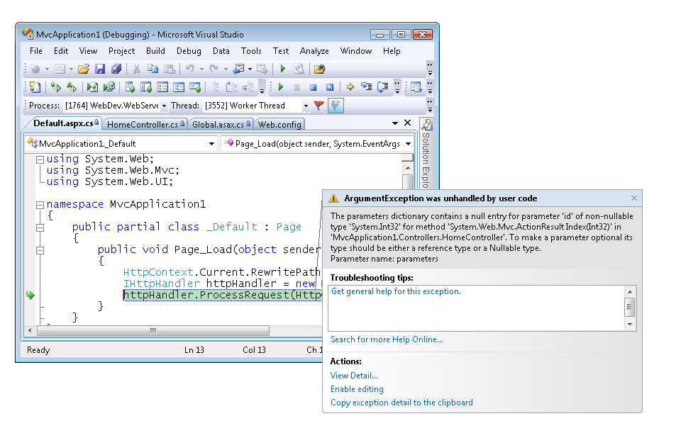Por fim, invocar o método Index() na Listagem 5 com a URL /Home causa uma exceção, pois o parâmetro Id não é um parâmetro anulável. Se você tentar invocar o método Index(), receberá o erro exibido na Figura 1.