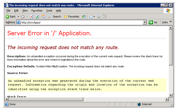 Depois de habilitar mapas de script curinga, você precisa modificar a tabela de rotas no arquivo Global.asax para que ela inclua uma rota Raiz. Caso contrário, você receberá a página de erro na Figura 5 ao fazer uma solicitação para a página raiz do aplicativo. Você pode usar o arquivo Global.asax modificado na Listagem 4.