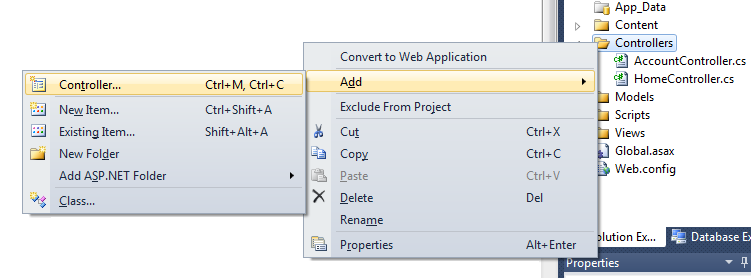 Vamos criar um novo controlador clicando com o botão direito do mouse na pasta controladores na solução Explorer e selecionando Adicionar Controlador.
