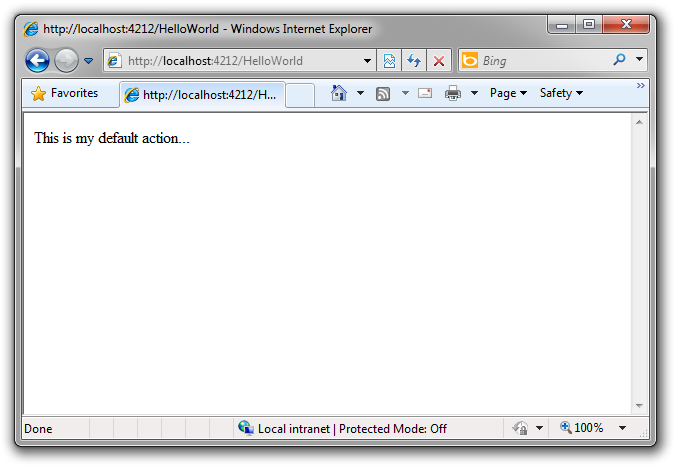 A primeira parte da URL determina a classe Controller a ser executada. Assim /HelloWorld mapeia para a classe HelloWorldController. A segunda parte da URL determina o método Action na classe a ser executada. Assim, /HelloWorld/Index faria com que o método Index() da classe HelloWorldController fosse executado. Observe que só tínhamos que visitar /HelloWorld acima e o método Index estava implícito. Isso ocorre porque um método chamado "Index" é o método padrão que será chamado em um controlador se um não for especificado explicitamente.