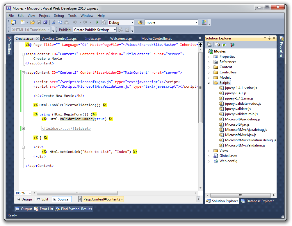 Como nossa classe Movie já tem alguns atributos de validação, só precisaremos adicionar alguns arquivos JavaScript ao nosso modelo Create.aspx View e adicionar uma linha de código para permitir que a validação do lado do cliente ocorra.