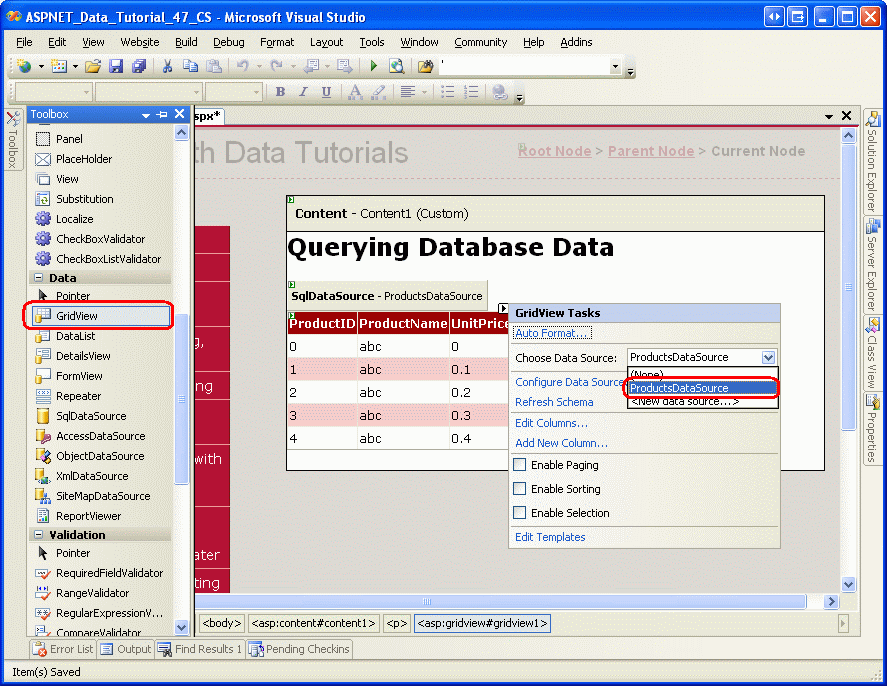 SelectCommand="SELECT [ProductID], [ProductName], [UnitPrice] FROM [Products]">