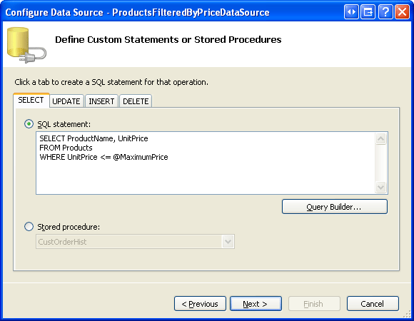 <asp:SqlDataSource ID="ProductsFilteredByPriceDataSource" runat="server"