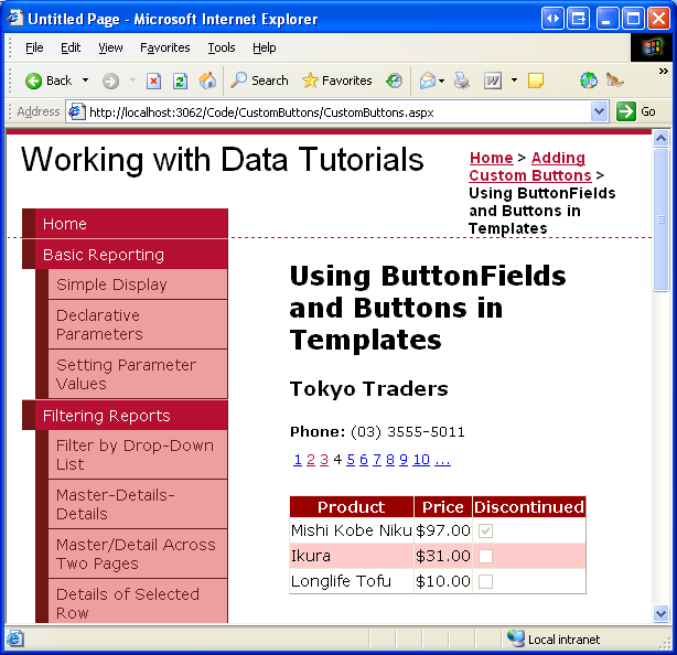 Assim como acontece com o botão Descontinuar todos os produtos, se você tiver desabilitado o estado de exibição do GridView, o GridView está sendo recuperado para o armazenamento de dados subjacente em cada postback e, portanto, será atualizado imediatamente para refletir uma alteração de preço que ocorre ao clicar em qualquer um dos botões. Se, no entanto, você não tiver desabilitado o estado de exibição no GridView, será necessário revincular manualmente os dados ao GridView depois de fazer essa alteração. Para fazer isso, basta fazer uma chamada para o método DataBind() do GridView imediatamente após invocar o método UpdateProduct.