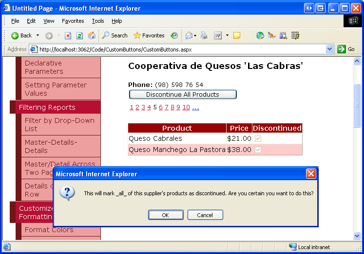 Se você clicar em OK na caixa de diálogo de confirmação do lado do cliente, o envio do formulário continuará, causando um postback no qual o evento FormView s ItemCommand será acionado. O manipulador de eventos que criamos será então executado, invocando o DiscontinueAllProductsForSupplier(supplierID) método e descontinuando os produtos Queso Cabrales e Queso Manchego La Pastora.