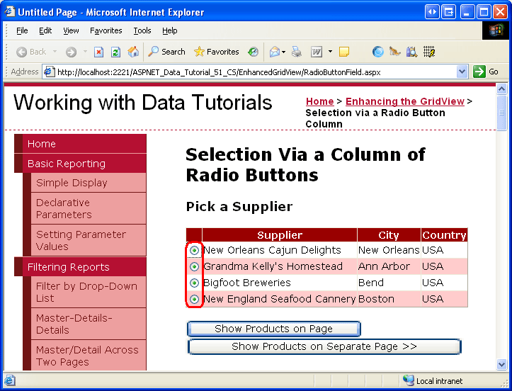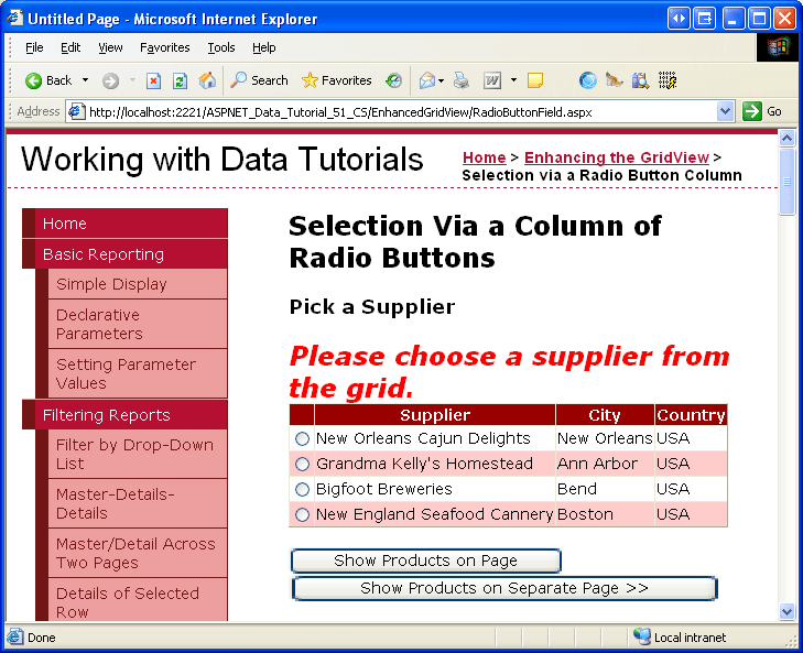 Este código funciona maravilhosamente, desde que se selecione um dos botões de opção no GridView. Se, inicialmente, o GridView não tiver nenhum botão de opção selecionado e o utilizador clicar no botão SendToProducts, SuppliersSelectedIndex será -1, o que fará com que uma exceção seja lançada, uma vez que -1 está fora do intervalo dos índices da coleção DataKeys. Todavia, isto não é um problema, caso tenha decidido atualizar o RowCreated manipulador de eventos conforme discutido na Etapa 3, de modo a ter o primeiro botão de rádio no GridView inicialmente selecionado.