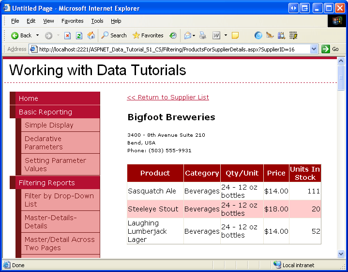 Visite a página em um navegador e clique SendToProducts no botão antes de selecionar um fornecedor no GridView. Como mostra a Figura 14, isso exibe o ChooseSupplierMsg rótulo. Em seguida, selecione um fornecedor e clique no SendToProducts botão. Isto irá levá-lo a uma página que lista os produtos fornecidos pelo fornecedor selecionado. A Figura 15 mostra a ProductsForSupplierDetails.aspx página em que o fornecedor da Bigfoot Breweries foi selecionado.