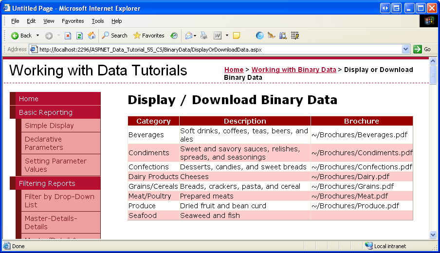 Neste tutorial, examinamos como apresentar dados binários. A forma como os dados são apresentados depende do tipo de dados. Para os ficheiros da brochura em PDF, oferecemos ao utilizador um link Ver Brochura que, quando clicado, levava o utilizador diretamente para o ficheiro PDF. Para a imagem da categoria, primeiro criamos uma página para recuperar e retornar os dados binários do banco de dados e, em seguida, usamos essa página para exibir a imagem de cada categoria em um GridView.