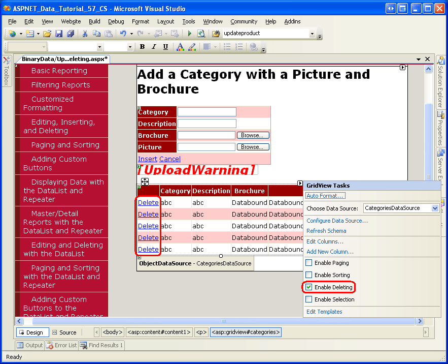 Como discutimos anteriormente no tutorial Visão geral da inserção, atualização e exclusão de dados , o GridView fornece recursos internos de exclusão e esses recursos podem ser habilitados no momento de uma caixa de seleção se a fonte de dados subjacente da grade suportar exclusão. Atualmente, o ObjectDataSource ao qual o GridView está vinculado (CategoriesDataSource) não oferece suporte à exclusão.