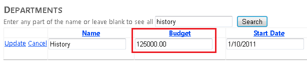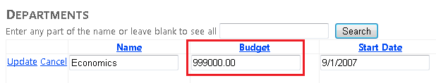 Clique em Editar em uma linha e altere o valor na coluna Orçamento . (Lembre-se de que você só pode editar registros criados para este tutorial, pois os registros de banco de dados existentes School contêm alguns dados inválidos. O registro para o departamento de Economia é seguro para experimentar.)