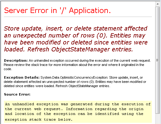 Execute a página e crie um conflito de simultaneidade novamente. Desta vez, você verá uma mensagem de erro: