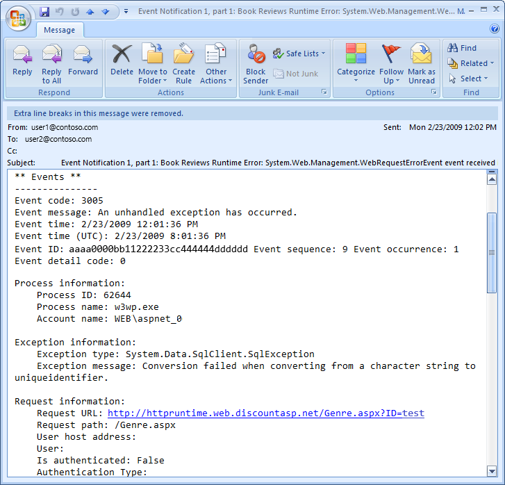 A Figura 2 mostra o e-mail gerado pela turma SimpleMailWebEventProvider ao visitar Genre.aspx?ID=fooo .