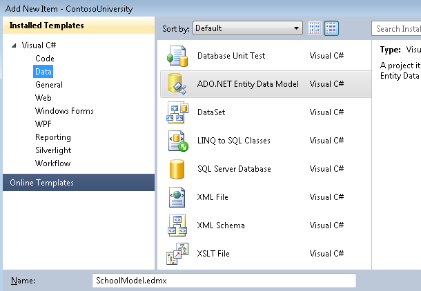 Para esses tutoriais, você usará o designer de modelo de dados do Entity Framework para criar automaticamente o modelo de dados com base em um banco de dados existente (geralmente chamado de abordagem de primeiro banco de dados ). Uma alternativa que não é abordada nesta série de tutoriais é criar o modelo de dados manualmente e, em seguida, fazer com que o designer gere scripts que criam o banco de dados (a abordagem de primeiro modelo ).