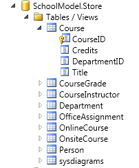 Expanda SchoolModel.Store para ver as tabelas, expanda Tabelas/Exibições para ver tabelas e, em seguida, expanda Curso para ver as colunas dentro de uma tabela.