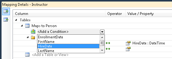 Clique com o botão direito do mouse na Instructor entidade e selecione Mapeamento de Tabela. Na janela Detalhes do Mapeamento , clique em Adicionar uma Tabela ou Exibição e selecione Pessoa.