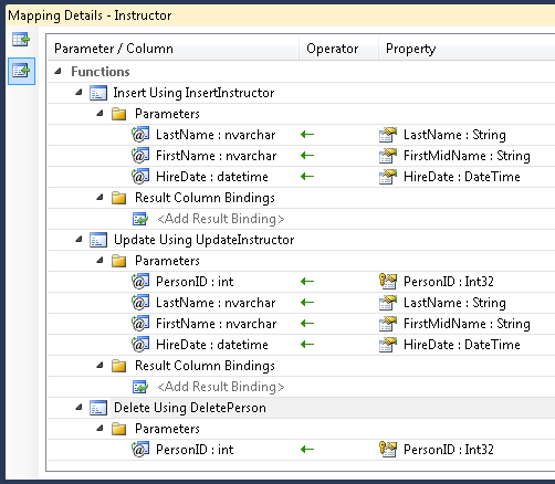 Neste tutorial, você mapeará todas as três funções – inserir, atualizar e excluir – para cada tipo de entidade. O Entity Framework versão 4 permite mapear apenas uma ou duas dessas funções para procedimentos armazenados sem mapear as outras, com uma exceção: se você mapear a função de atualização, mas não a função delete, o Entity Framework lançará uma exceção quando você tentar excluir uma entidade. No Entity Framework versão 3.5, você não tinha tanta flexibilidade no mapeamento de procedimentos armazenados: se você mapeou uma função, era necessário mapear as três.