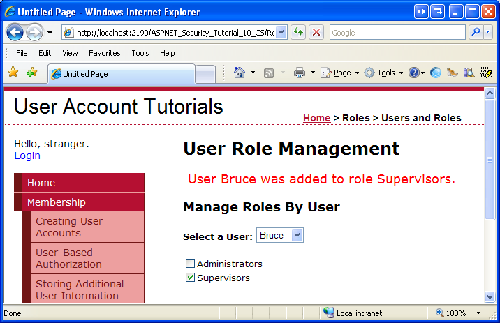 Visite a página por meio de um navegador e selecione a função Supervisores no RoleList DropDownList. Tente inserir um nome de usuário inválido – você deverá ver uma mensagem explicando que o usuário não existe no sistema.