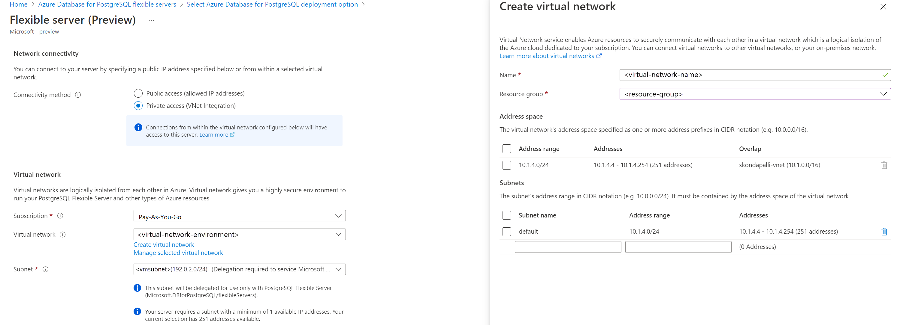 Vá para a guia Rede e selecione acesso privado. Não é possível alterar o método de conectividade depois de criar o servidor. Selecione Criar rede virtual para criar uma nova rede virtual vnetenvironment1. Selecione OK depois de fornecer o nome da rede virtual e as informações da sub-rede.