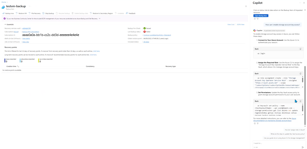 Você pode usar o Copilot para solucionar as falhas de trabalho associadas a um cofre dos Serviços de Recuperação ou a um cofre de Backup.