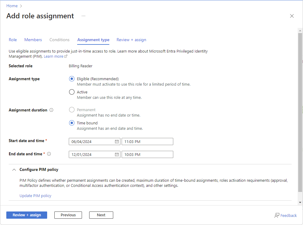 Se você tiver uma licença do Microsoft Entra ID P2 ou do Microsoft Entra ID Governance, o Microsoft Entra Privileged Identity Management (PIM) será integrado às etapas de atribuição de função. Por exemplo, você pode atribuir funções a usuários por um período de tempo limitado. Você também pode tornar os usuários qualificados para atribuições de função para que eles tenham que ativá-los para usar a função, como solicitar aprovação. As atribuições de função qualificadas fornecem acesso just-in-time a uma função por um período limitado de tempo.