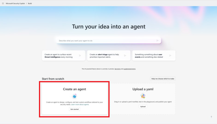 Selecione o card Criar um agente.