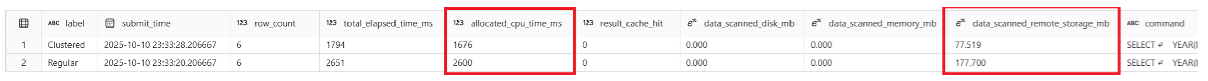 Ambas as consultas têm um número de linhas de 6 e tempos de submissão semelhantes. A Clustered consulta mostra total_elapsed_time_ms de 1794, allocated_cpu_time_ms de 1676 e data_scanned_remote_storage_mb de 77.519. A Regular consulta mostra total_elapsed_time_ms 2651, allocated_cpu_time_ms 2600 e data_scanned_remote_storage_mb 177,700. Estes números demonstram que, embora ambas as consultas tenham retornado os mesmos resultados, a Clustered versão utilizou aproximadamente 36% menos tempo de CPU do que a Regular versão e digitalizou cerca de 56% menos dados no disco. Nenhuma cache foi usada em nenhuma das execuções de consulta. Estes são resultados significativos para ajudar a reduzir o tempo de execução da consulta e o consumo de consultas, tornando a lpepPickupDatetime coluna uma forte candidata para clusterização de dados.