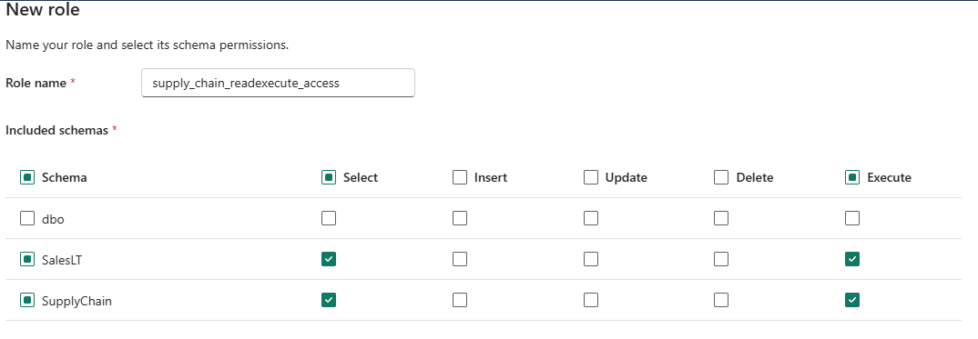 SalesLTesquemas eSupplyChain. Desmarque todas as caixas de seleção, exceto Selecionar e Executar.Selecione Guardar.