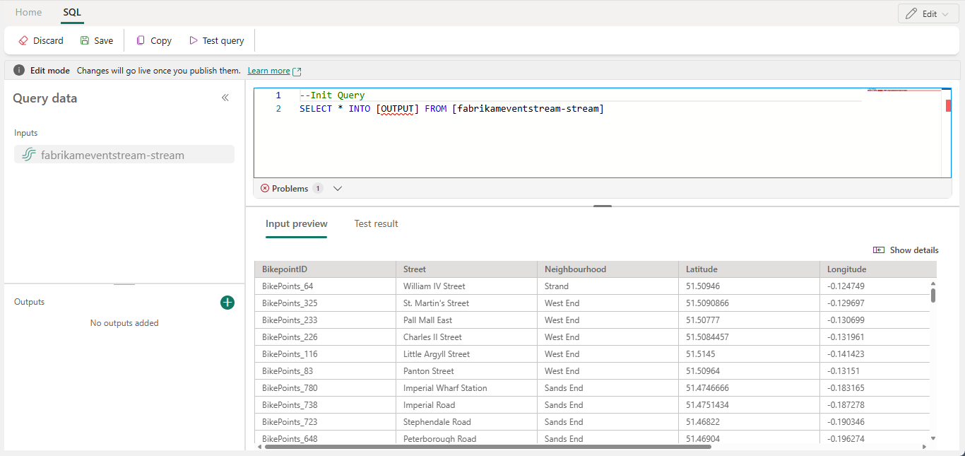 Edite a consulta na área de consulta ou selecione Editar consulta para inserir a exibição do editor de código em tela cheia.