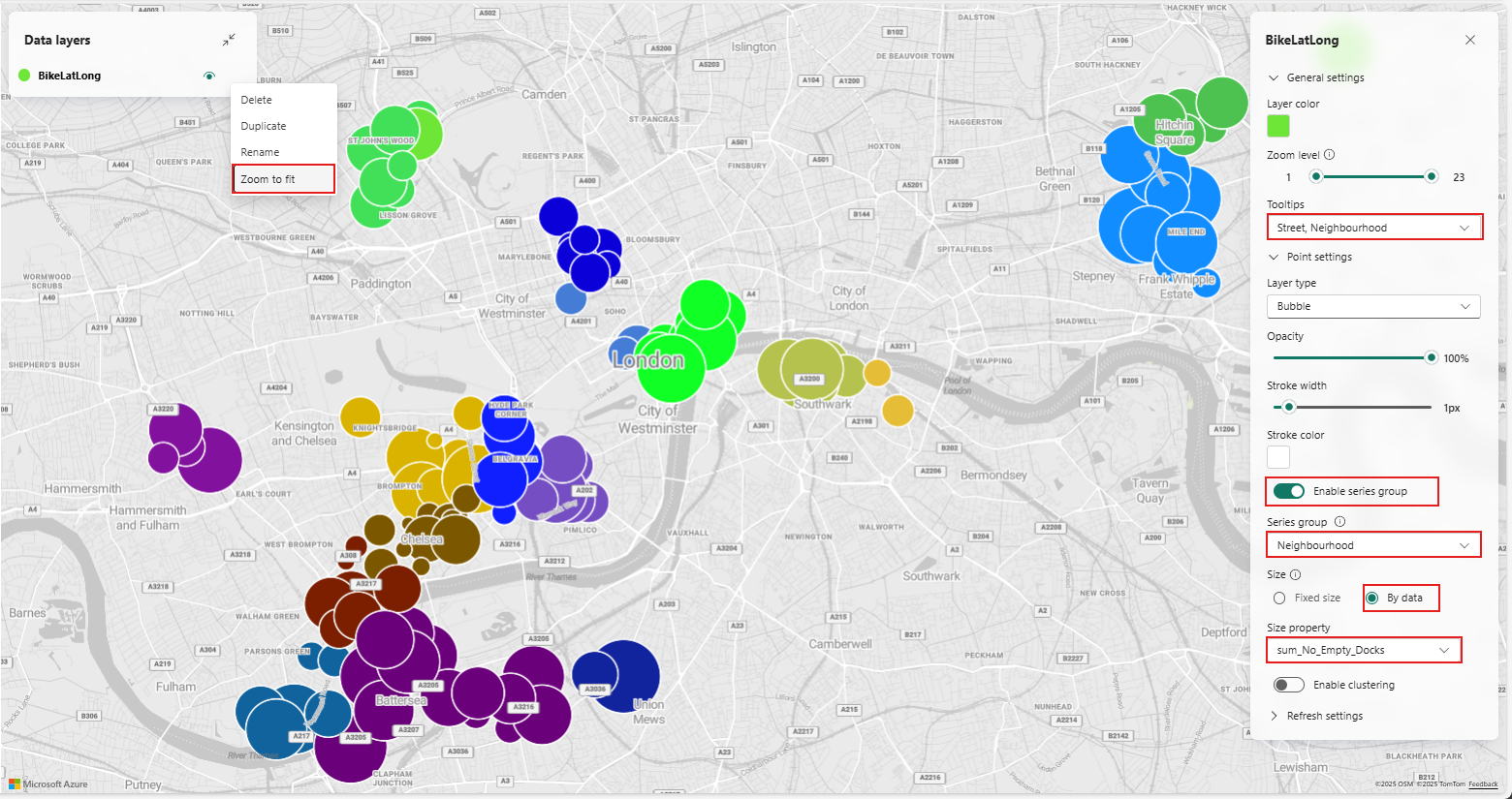 Clique com o botão direito do mouse em BikeLatLong em Camadas de dados e selecione Faça zoom para ajustar para ampliar a área de Londres e mostrar as estações de bicicleta no mapa.