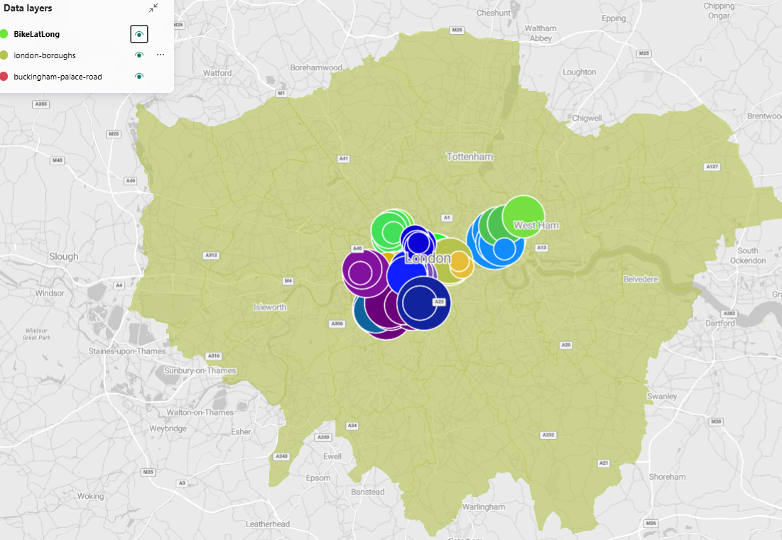 Devemos ver os limites do bairro e a estrada do Palácio de Buckingham no mapa. Você pode alternar a visibilidade de cada camada clicando no ícone de olho ao lado de cada camada em Camadas de dados.