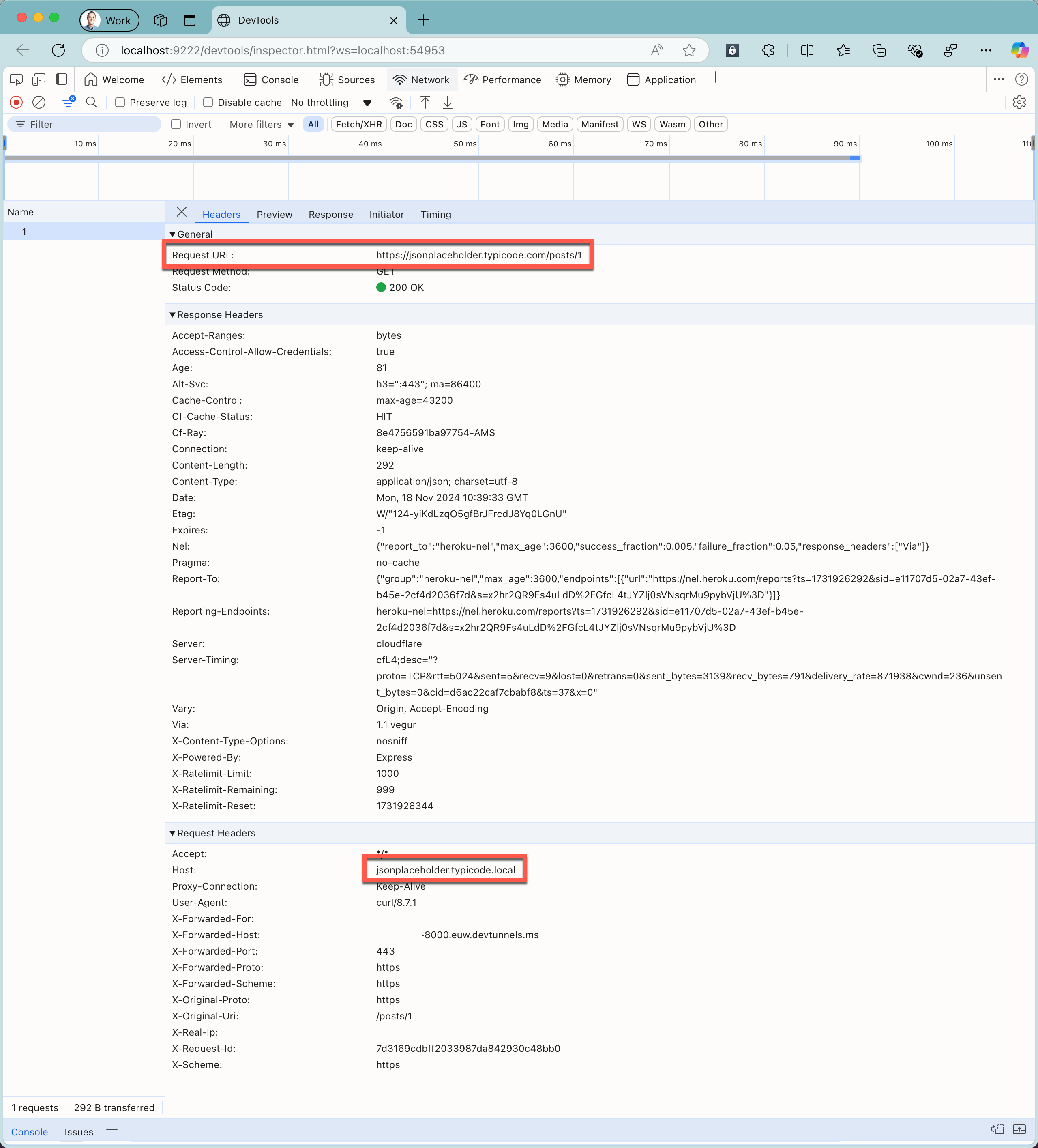 curl https://tunnel_id-8000.euw.devtunnels.ms/posts/1.No navegador da Web com as Ferramentas de Desenvolvimento do Chrome, observe as informações sobre a solicitação intercetada e a resposta da API na nuvem.