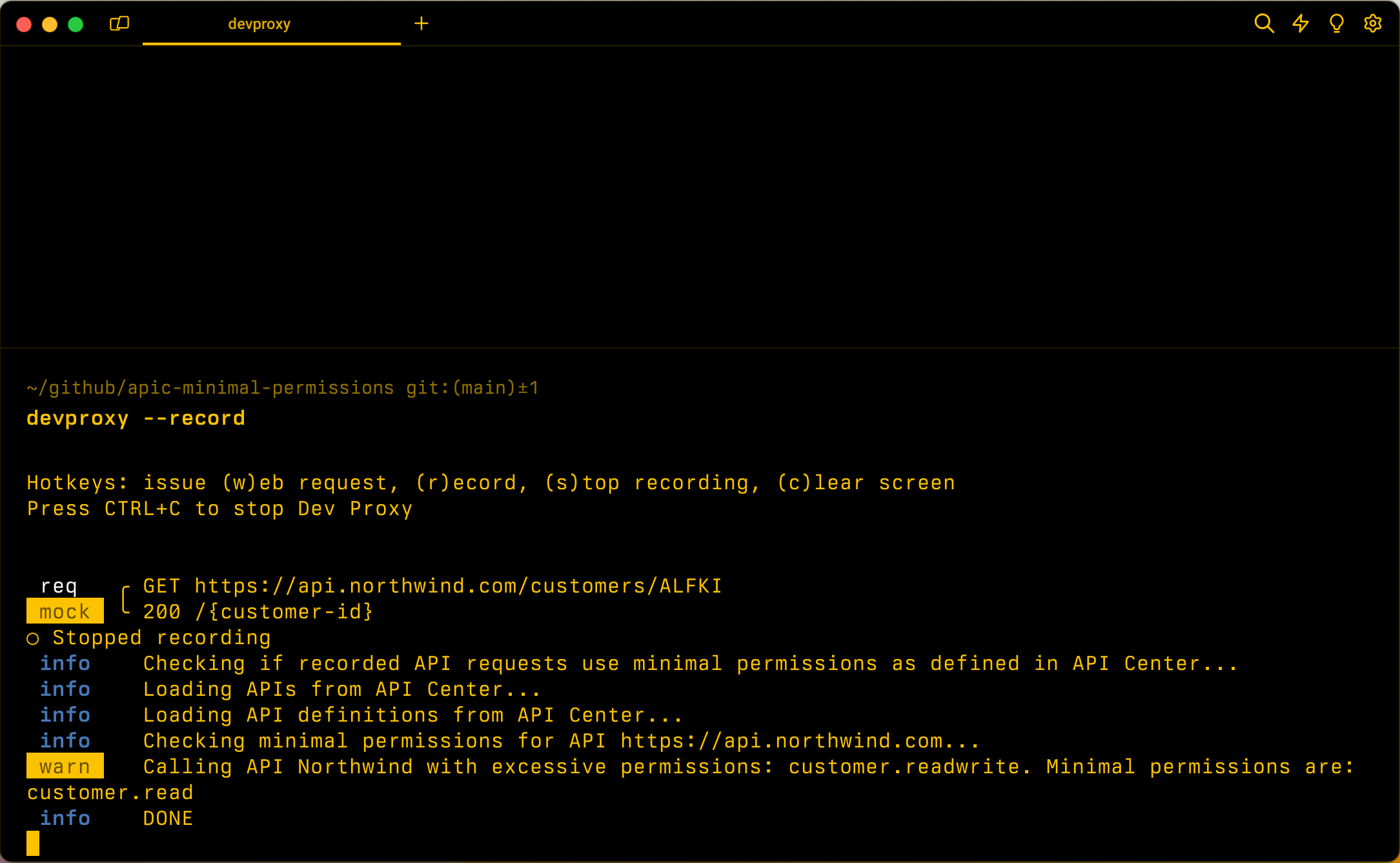 O ApiCenterMinimalPermissionsPlugin plug-in dá suporte à verificação de permissões OAuth para APIs protegidas com OAuth registrado no Centro de API do Azure. O plug-in calcula as permissões mínimas necessárias para chamar as APIs usadas no aplicativo usando as informações do Centro de APIs. Em seguida, o plug-in compara as permissões usadas no token JSON Web Token (JWT) com os escopos mínimos necessários para as solicitações que o Dev Proxy registrou.