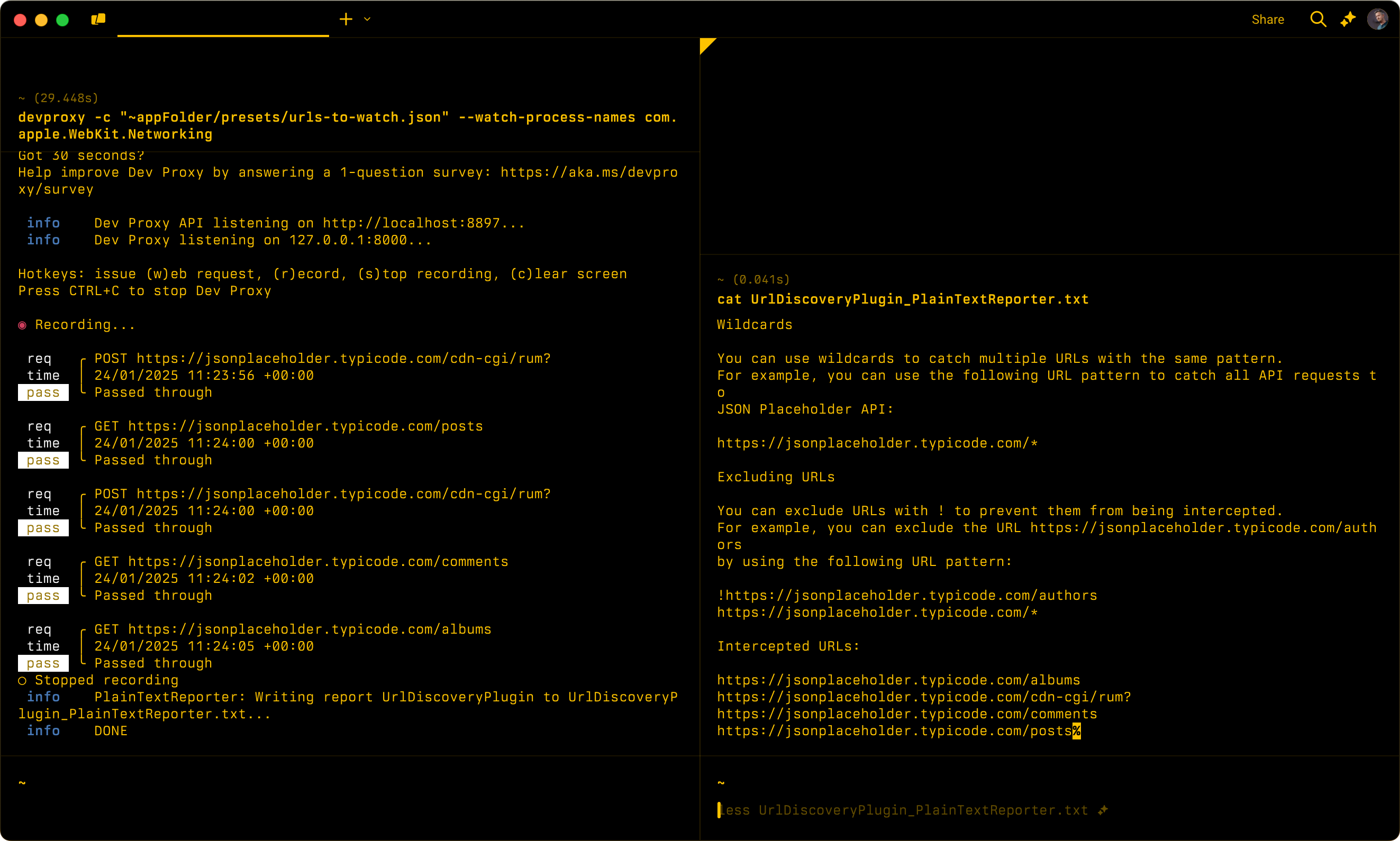 Cria uma lista de URLs que o Dev Proxy intercetou. Use este plug-in para saber quais URLs seu aplicativo está chamando e como configurar o Proxy de Desenvolvimento para simular comportamentos para eles.