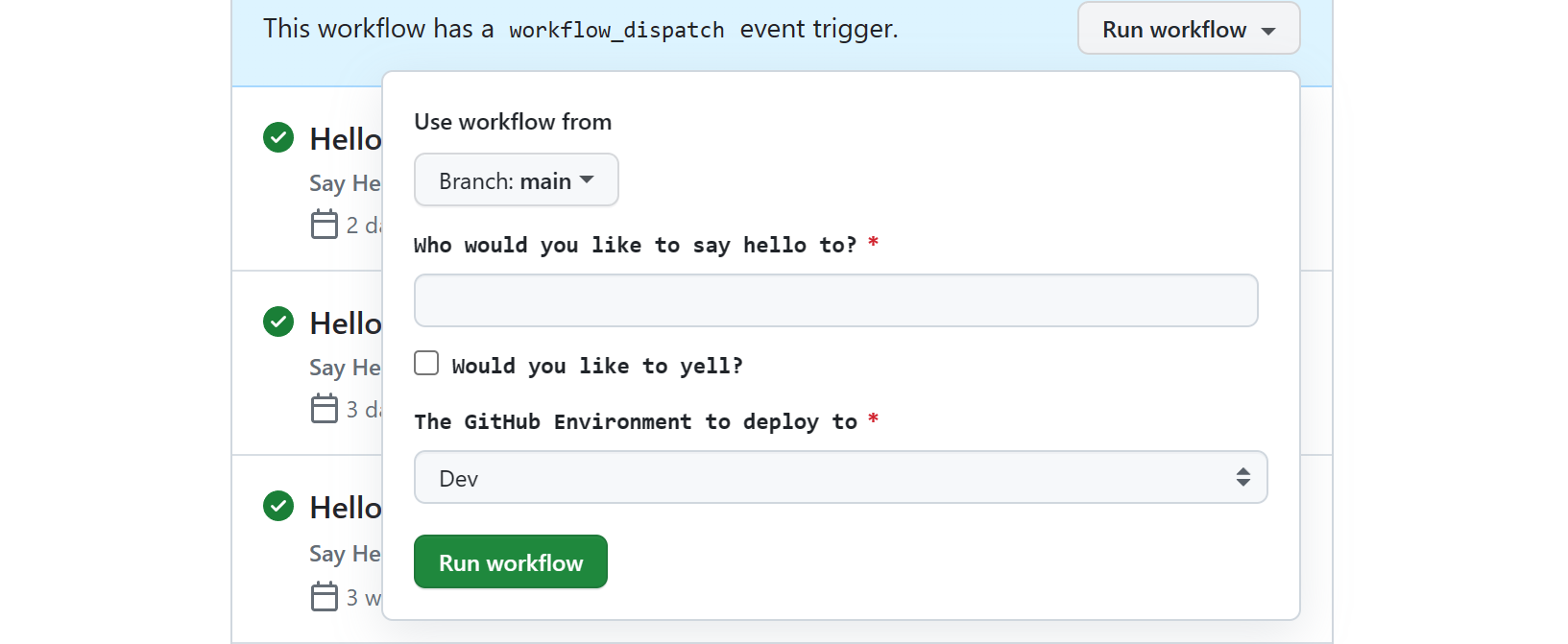 Felizmente, a maioria dos sistemas de CI, incluindo Ações do GitHub e Pipelines do Azure, tem a capacidade de configurar um fluxo de trabalho com entradas que você pode acionar manualmente por meio de suas UIs ou CLIs. Dado que os desenvolvedores e funções relacionadas com operações provavelmente já estão familiarizados com estas experiências do utilizador, os gatilhos manuais podem aumentar o padrão de tudo como código para permitir a automação para atividades (ou tarefas) que não têm uma representação de arquivo natural ou devem ser totalmente automatizadas sem necessitar de um processo de PR.