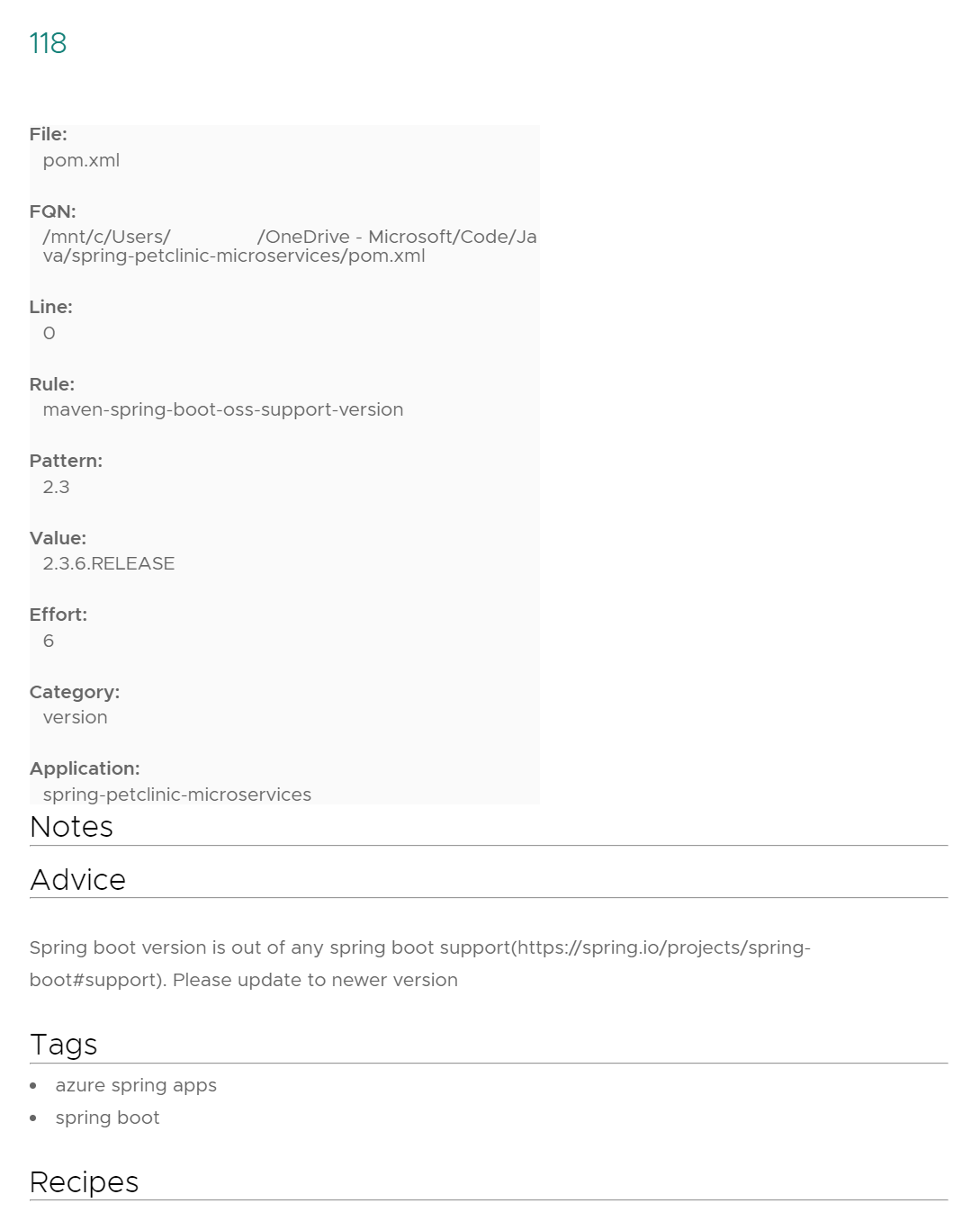 Na página Aplicação , pode selecionar o ID de um problema para ver informações detalhadas e ações sugeridas. Estas informações incluem o caminho do ficheiro de código fonte com o problema encontrado, o padrão correspondente ao problema e a regra que descreve o padrão e a classificação de esforço. Na secção Conselhos , pode encontrar a explicação específica para o problema encontrado e a ação correspondente sugerida.