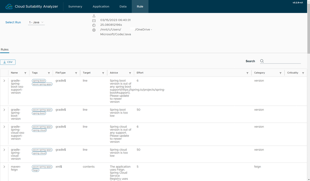 O Cloud Suitability Analyzer estima a preparação das suas aplicações spring em relação às plataformas na cloud ao corresponder padrões ao código fonte. A ferramenta atribui a cada problema uma classificação não processada com base num conjunto de regras predefinidas ou personalizadas. Em seguida, a ferramenta calcula uma classificação técnica entre 0 e 10 para cada aplicação com base na soma das classificações não processadas. Quanto mais preparada para a cloud estiver uma aplicação, maior será a classificação técnica.