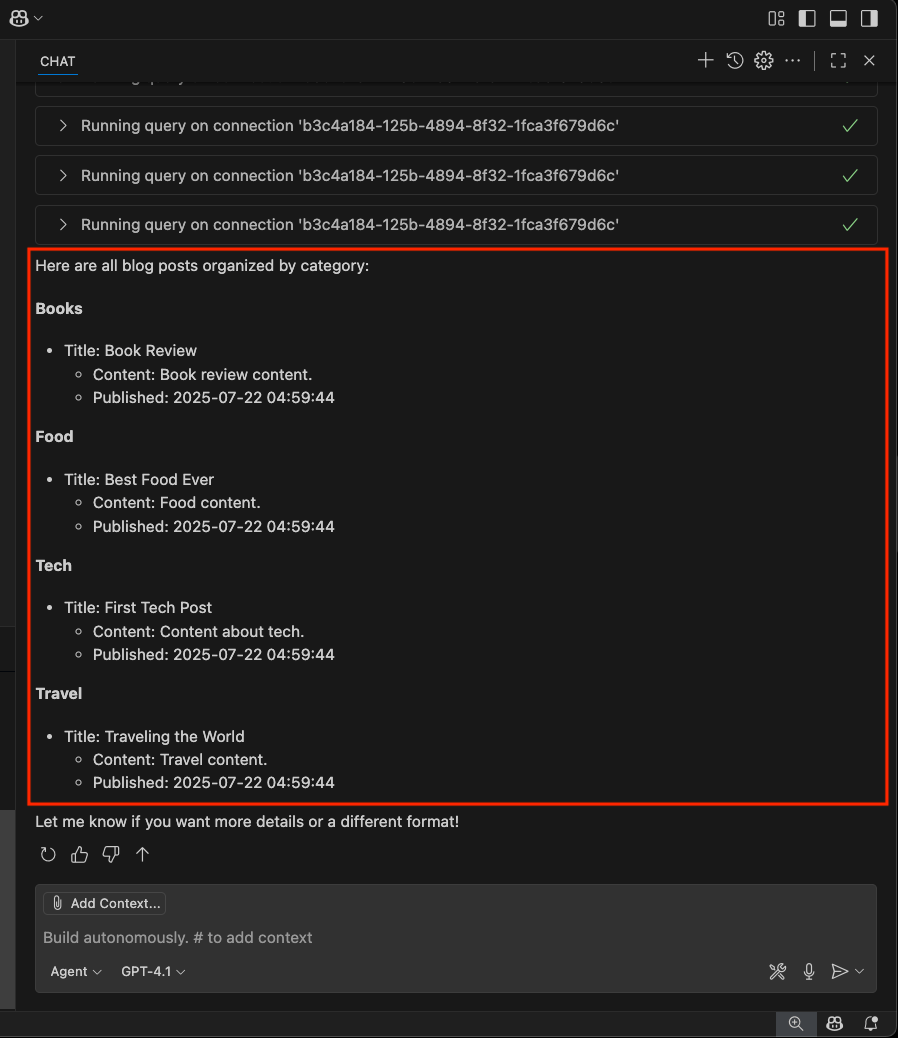 Você também pode usar variáveis de bate-papo, como #mssql_connect invocar essas ferramentas diretamente, ou escrever prompts em linguagem natural, como: