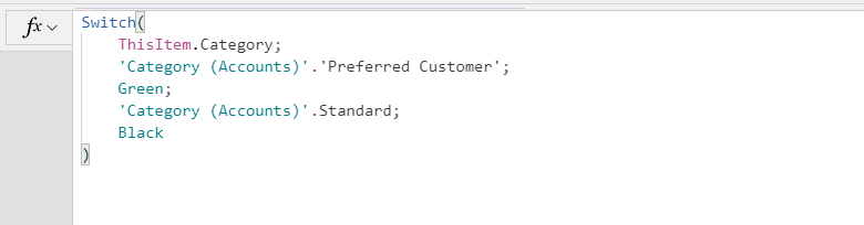 À medida que essa fórmula é composta, o Power Apps saberá os valores possíveis para a coluna Category e permitirá a seleção do valor a ser comparado na lista de valores conhecidos para a coluna de opção assim que você inserir o "." após o nome da coluna.