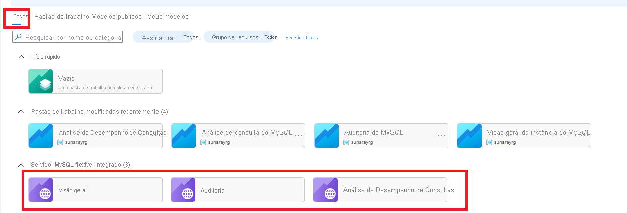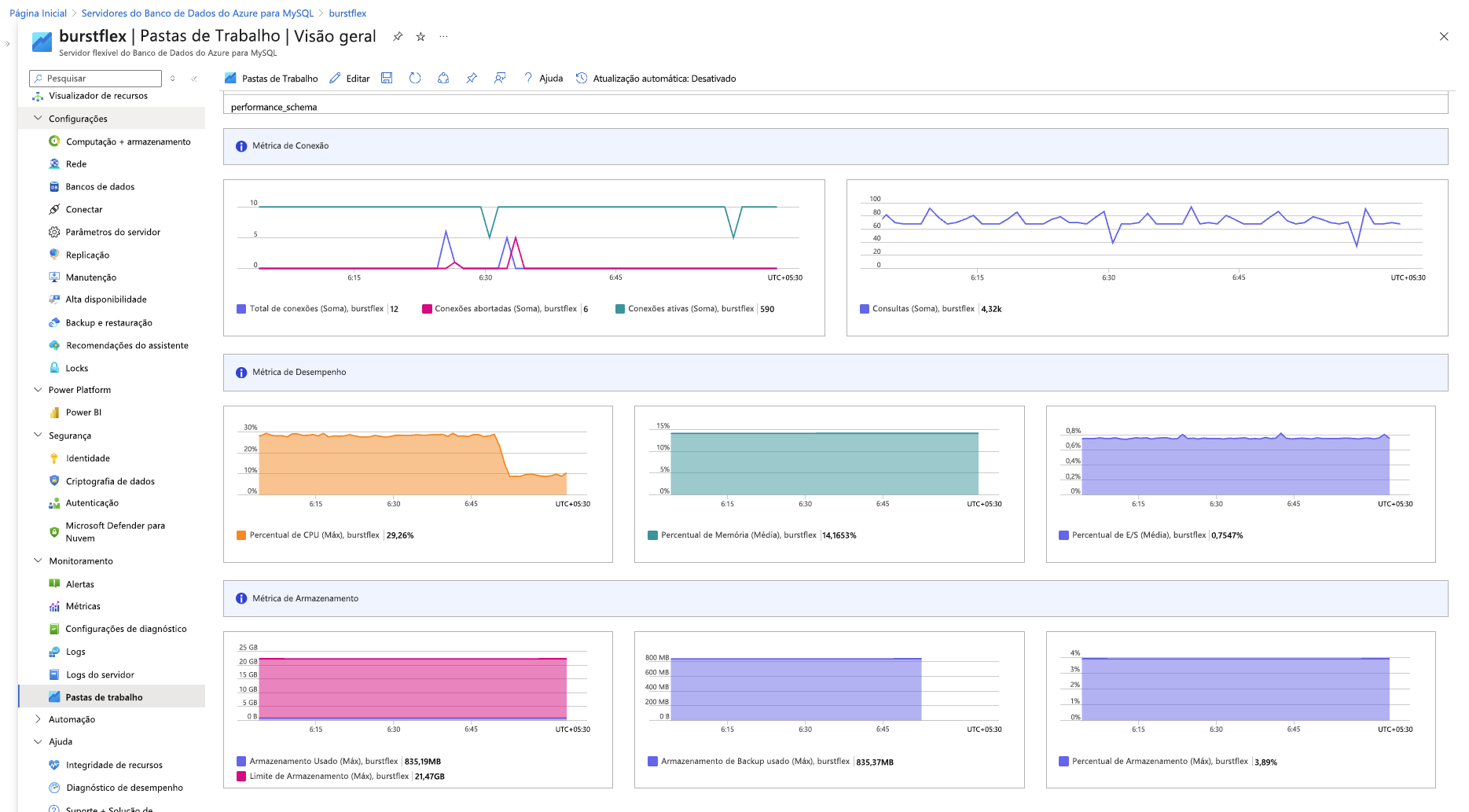 No portal do Azure, no painel esquerdo, em Monitoramento para sua instância de servidor flexível do Banco de Dados do Azure para MySQL, selecione Pastas de trabalho.