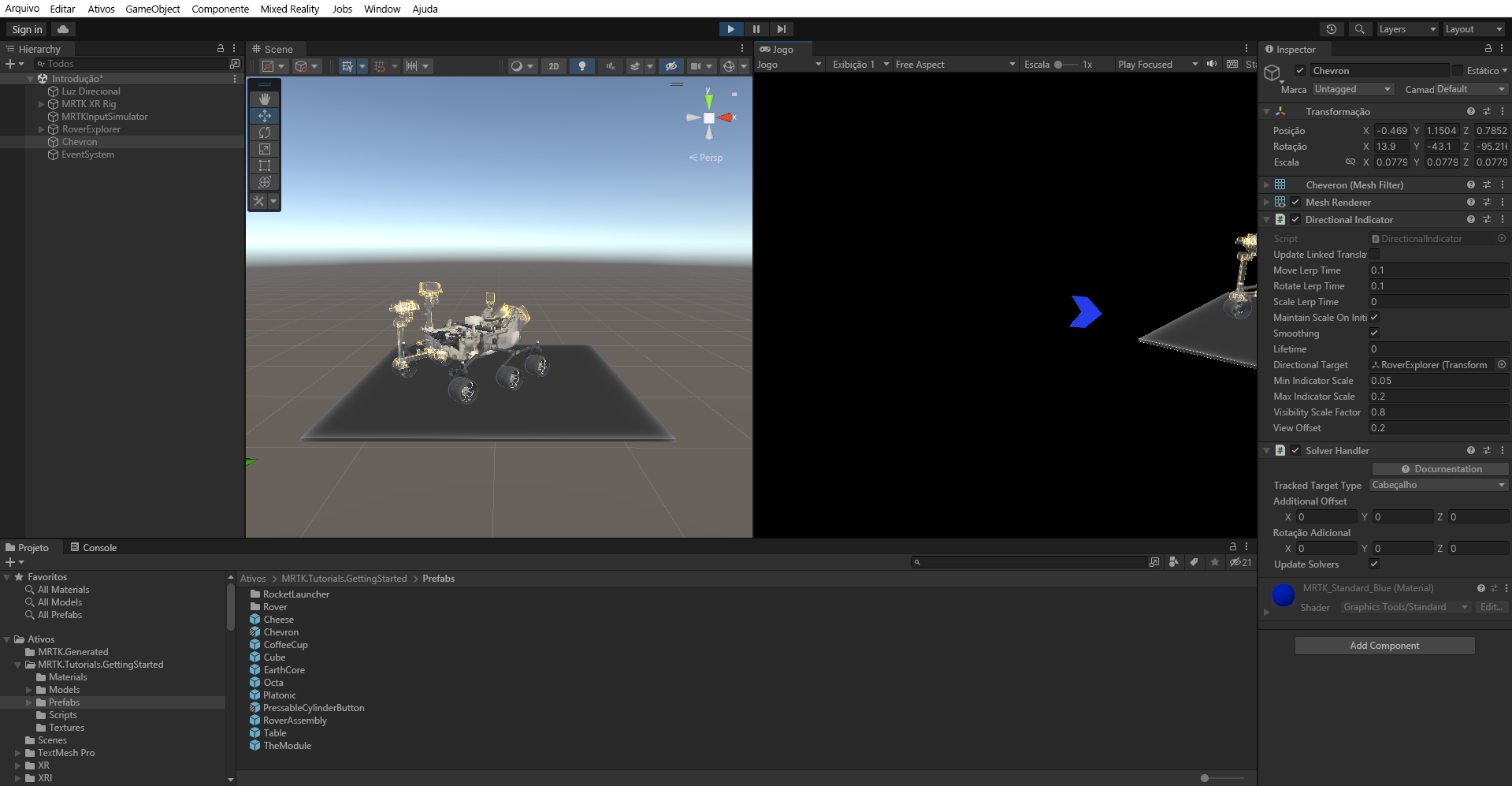 Observe que quando você desviar o olhar do objeto RoverExplorer , o objeto Indicator aparecerá e apontará para o objeto RoverExplorer .