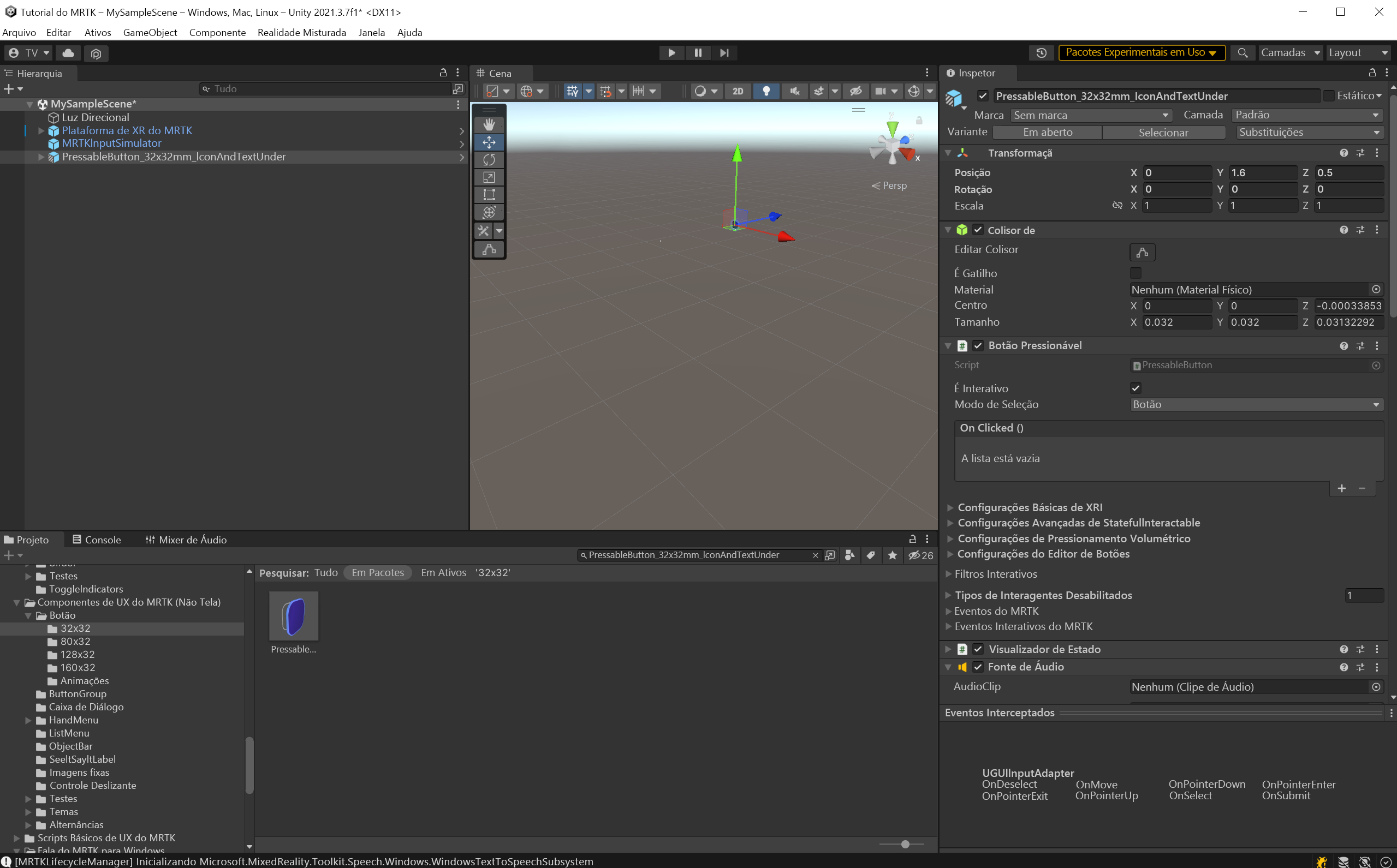 O botão prefab é a entrada representada por um ícone azul. Clique e arraste o PressableButton_32x32mm_IconAndTextUnder pré-fabricado para a Hierarquia. Com o objeto PressableButton_32x32mm_IconAndTextUnder ainda selecionado, na janela Inspetor, configure o componente Transform da seguinte maneira: