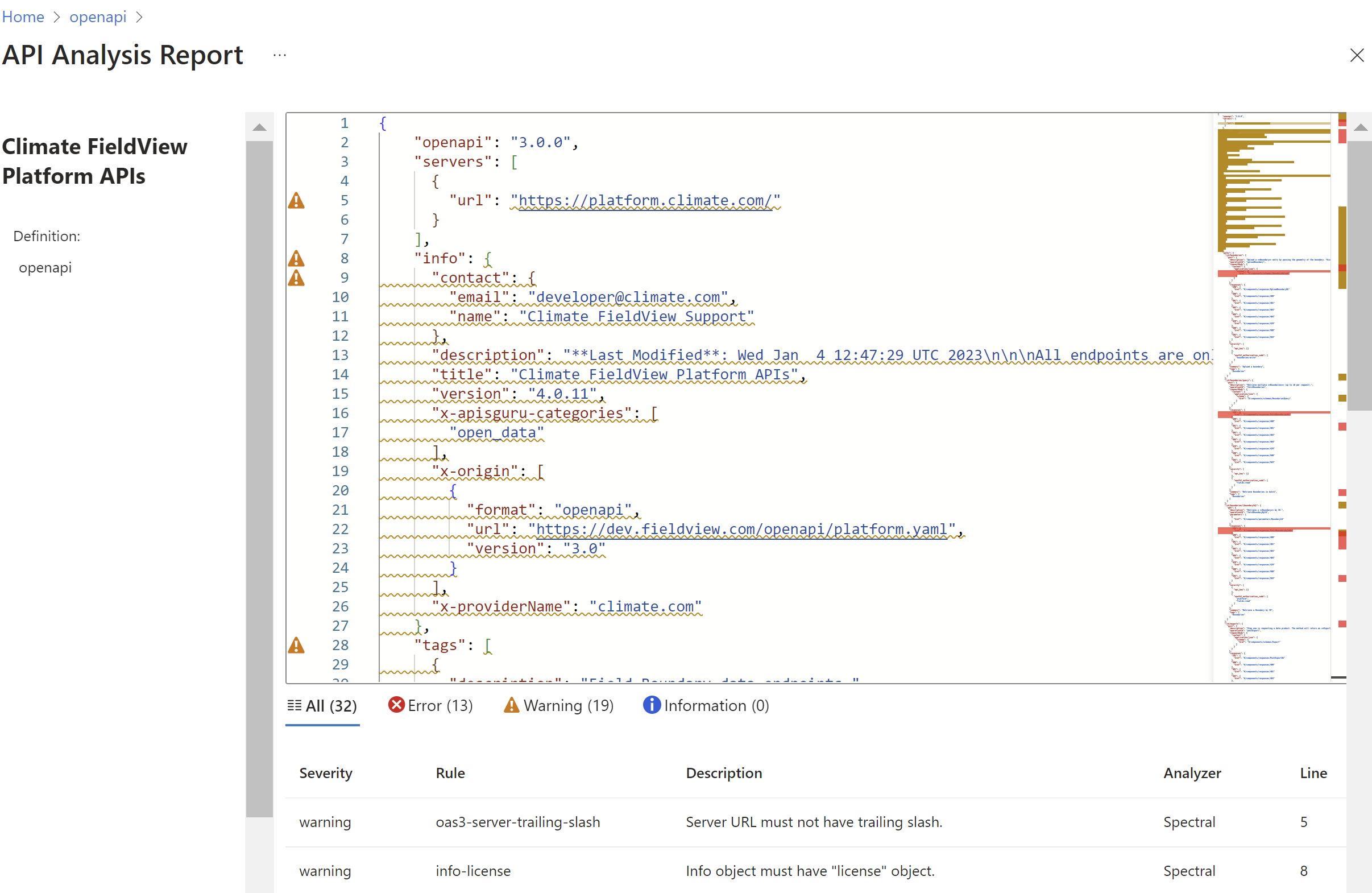 View an analysis summary and the analysis reports for your API definitions in the Azure portal. After API definitions are analyzed, the reports list errors, warnings, and information based on the configured API style guide.