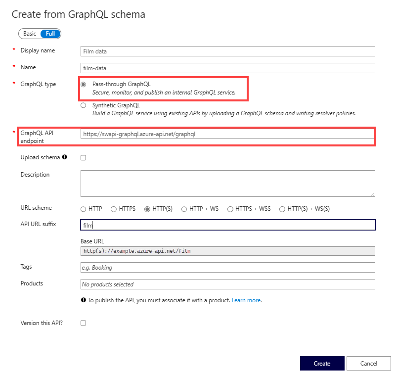 For example:https://example.com/your-GraphQL-name. You can also use a common SWAPI GraphQL endpoint likehttps://swapi-graphql.azure-api.net/graphqlfor the purpose of demonstration.Upload schema Optionally select to upload your schema file to replace the schema that's retrieved from the GraphQL endpoint (if you have one). Description Add a description of your API. URL scheme Select a scheme based on your GraphQL endpoint. Select one of the options that includes a WebSocket scheme (WS or WSS) if your GraphQL API includes the subscription type. The default selection is HTTP(S). API URL suffix Add a URL suffix to identify the specific API in the API Management instance. It has to be unique in the API Management instance. Base URL Uneditable field displaying your API base URL. Tags Optionally associate your GraphQL API with new or existing tags. Products Associate your GraphQL API with a product to publish it. Version this API? Select the checkbox to apply a versioning scheme to your GraphQL API. Select Create.