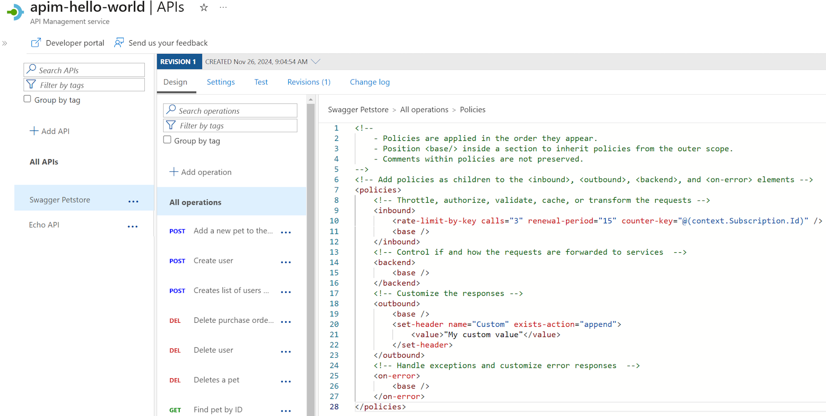 For example, you might want to set a custom response header. Or, protect your backend API by configuring a rate limit policy, so that the API isn't overused by developers. These examples are a simple introduction to API Management policies. For more policy options, see API Management policies.