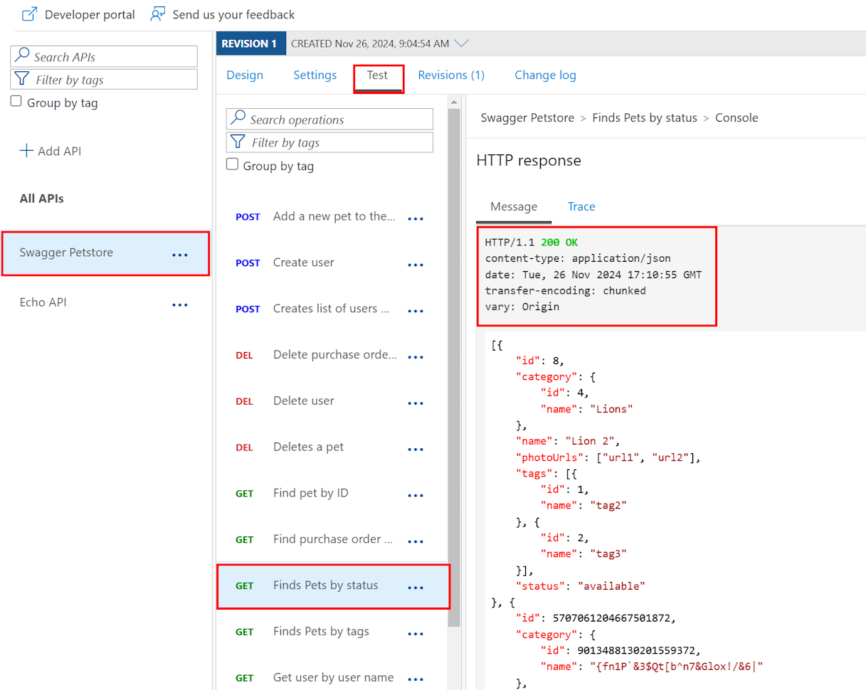 - Select the GET Finds pets by status operation, and optionally select a different value of the status Query parameter. Select Send.